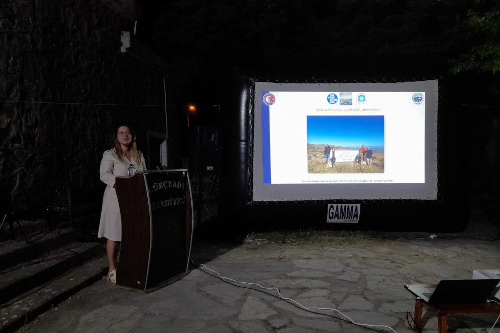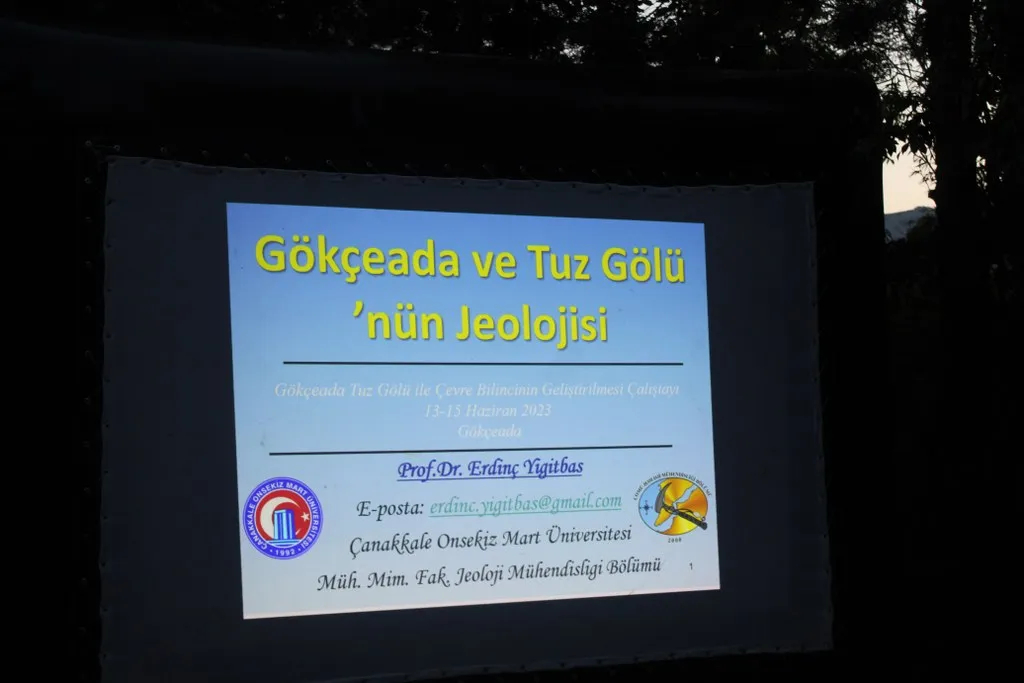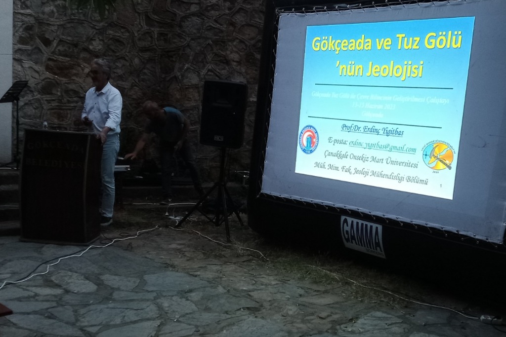 13 Haziran 2023 Salı günü Gökçeada Tuz Gölü Sulak Alanı’nın tepelerinde Prof. Dr. Erdinç YİĞİTBAŞ katılımcılara Gökçeada ve Tuz Gölü’nün Jeolojisini detaylarıyla anlatmış, Prof. Dr. Onur ÖZBEK ise Tuz Gölü’nün içerisinde Gökçeada Tuz Gölü’ndeki arkeolojik kalıntılar ve koruma statüleri hakkında bilgilendirmede bulunmuştur.